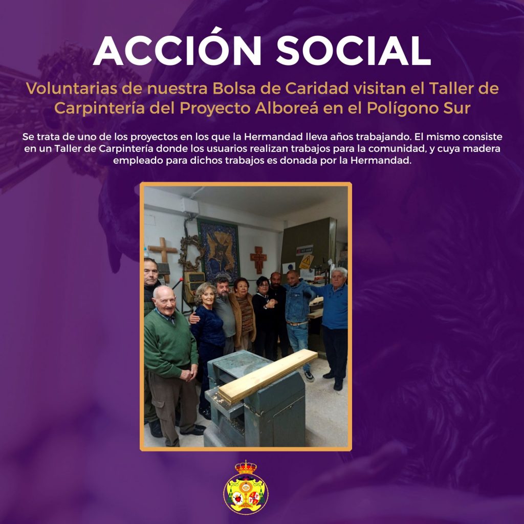 Voluntarias de nuestra Bolsa de Caridad han realizado su visita rutinaria al Taller de Carpintería del Proyecto Alboreá en el Polígono Sur. Se trata de un espacio donde los usuarios realizan trabajos para la comunidad y cuyos materiales empleados para desempeñar dicha labor son donados por la Hermandad.
