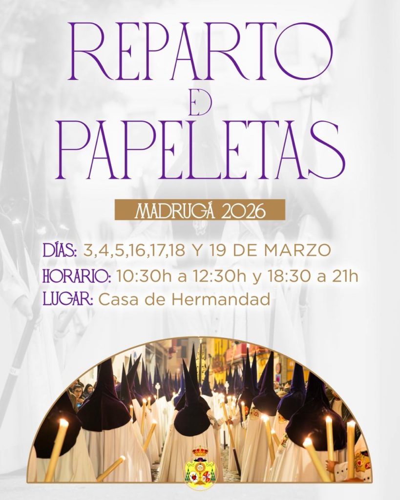 Los días 3, 4, 5, 16, 17, 18 y 19 de marzo, son los días designados para el reparto de las papeletas de sitio. Como de costumbre, se realizará en nuestra Casa Hermandad en horario de 10:30 a 12:30 horas por las mañanas y de 18:30 a 21:00 horas por las tardes.