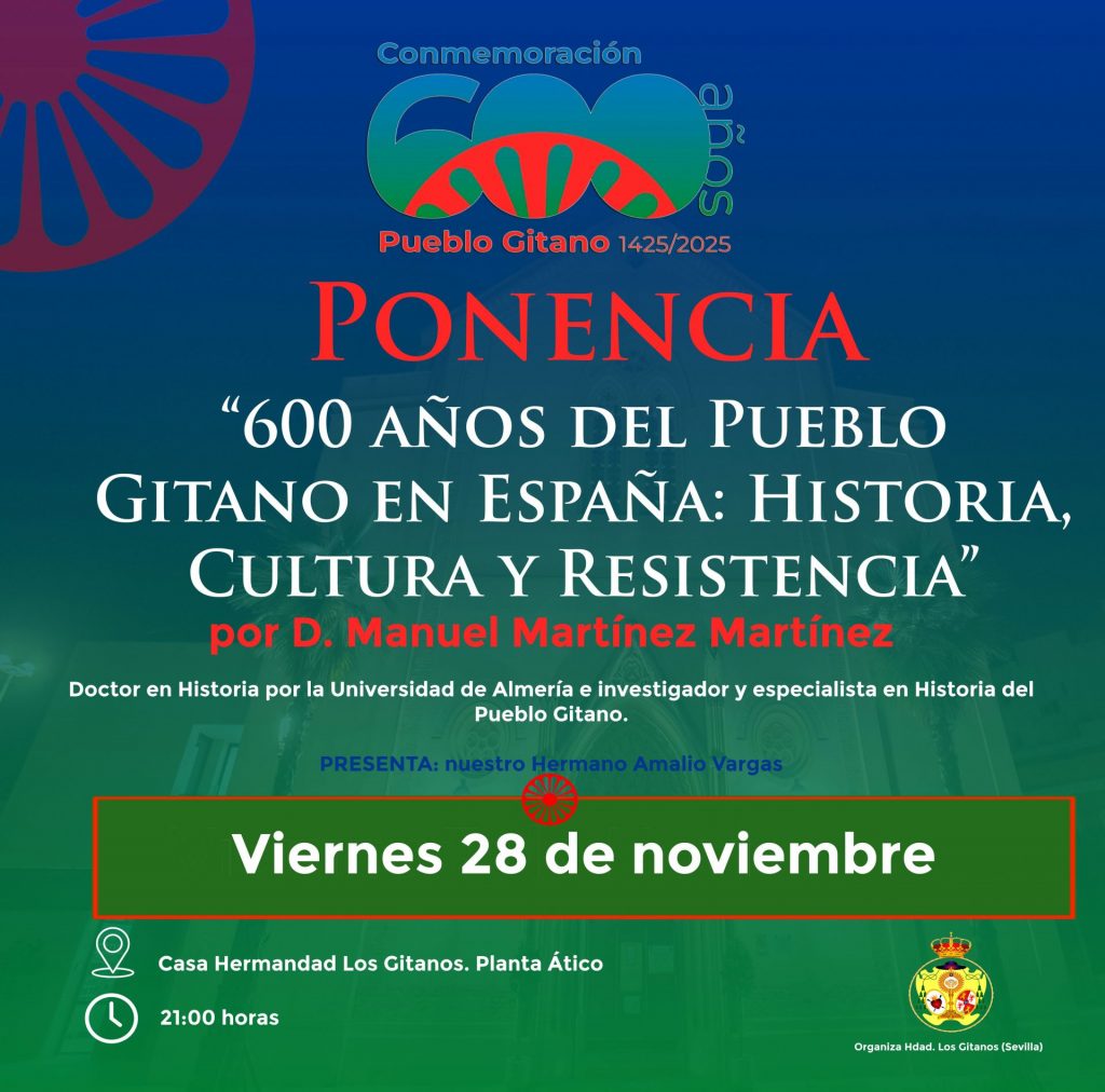 El protagonista de esta jornada será don Manuel Martínez Martínez, Doctor en Historia por la Universidad de Almería e investigador y especialista en la historia del pueblo gitano, quien se encargará de desarrollar la ponencia «600 años del Pueblo Gitano en España: Historia, Cultura y Resistencia”, que presentará nuestro hermano Amalio Vargas.