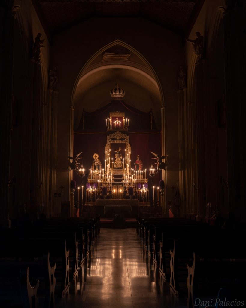 Bajo nuestros Titulares, un bosque de velas colocadas sobre vistosos candeleros de madera dorados, hasta llegar al banco del altar que es presidido por el Crucificado, que ha sido colocado en un espléndido manifestador de madera dorada, con talla estilo rocalla del siglo XVIII. Enmarcándolo, los cuatro preciosos ángeles mancebos del paso del Señor obra de Francisco Buiza.