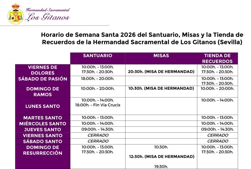 Se informa a hermanos, fieles y devotos que el horario de apertura y misas en Semana Santa del Santuario del Señor de la Salud y María Santísima de las Angustias Coronada, así como de la Tienda de Recuerdos es el siguiente:
