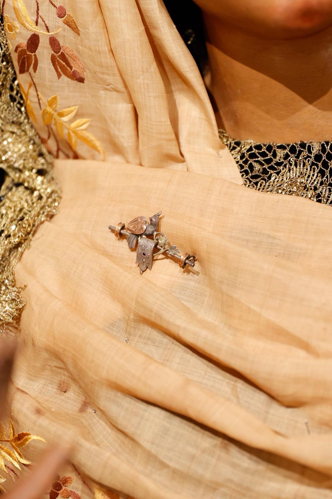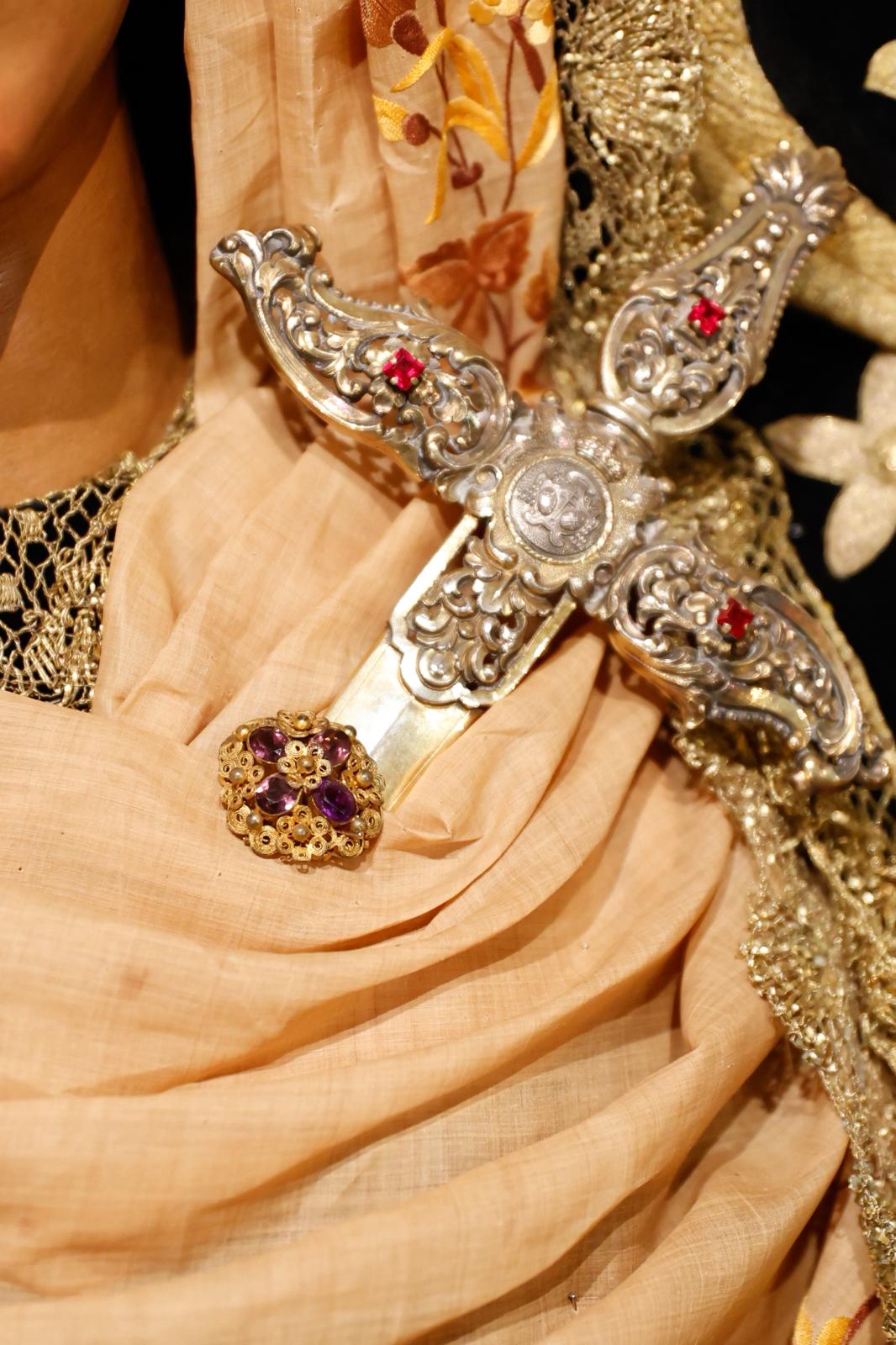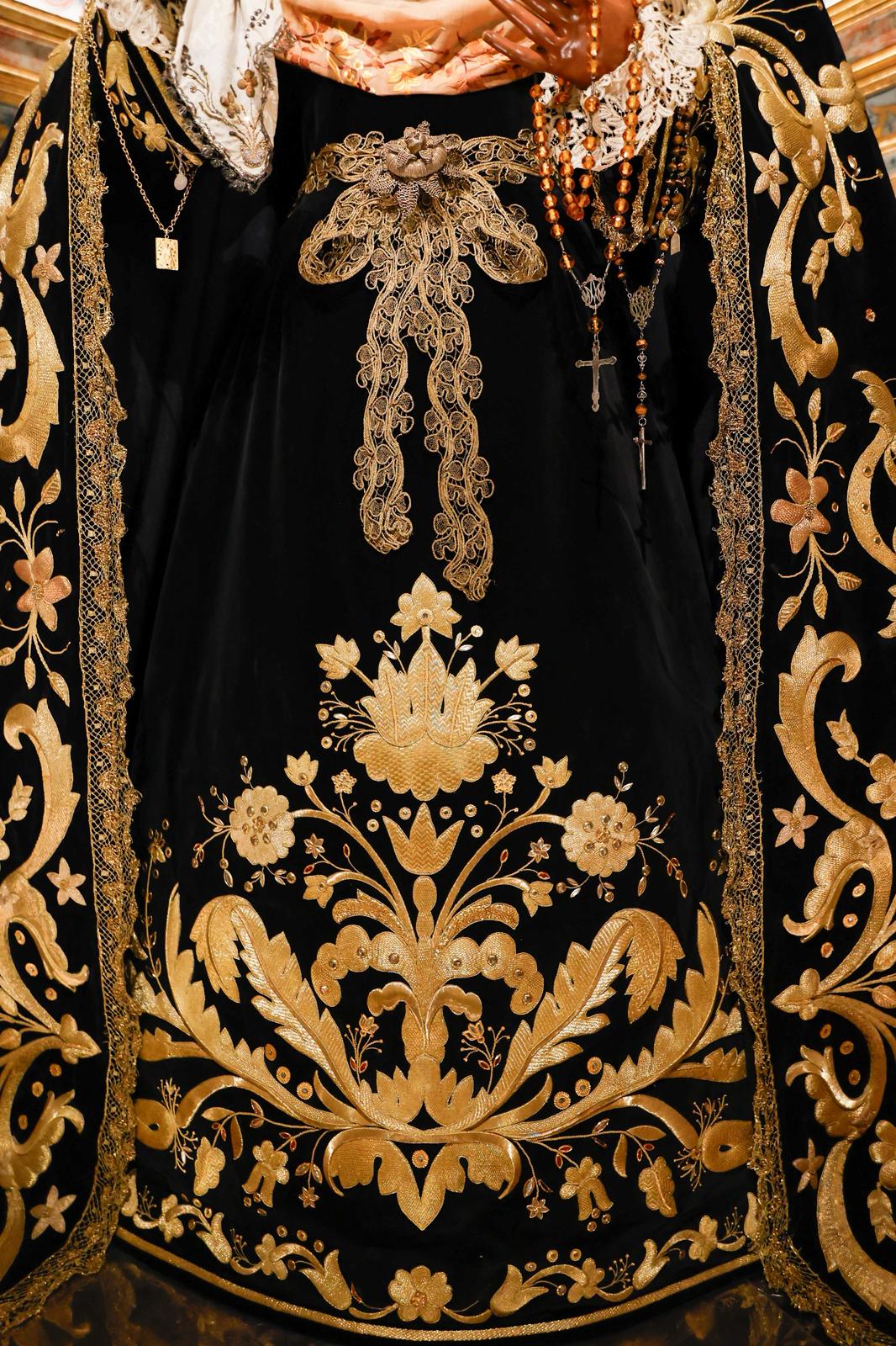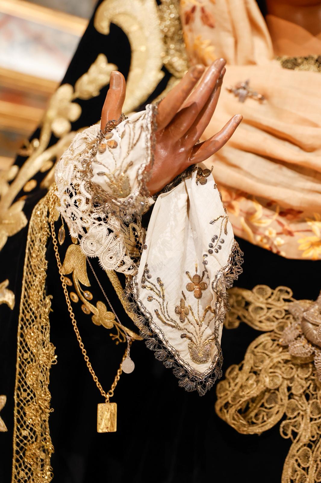 Los puños son un encaje Duquesa del siglo XIX donados por Francisco Conde en 2019, y el precioso pañuelo es una batista bordada en oro del siglo XIX donación del grupo de Confirmación en 2016, llamativo en su confección y tono, precisamente como decíamos antes, para que nos fijemos en él, en la mano ofrecida de la Virgen, en estos días en los que el dolor y el consuelo son protagonistas.