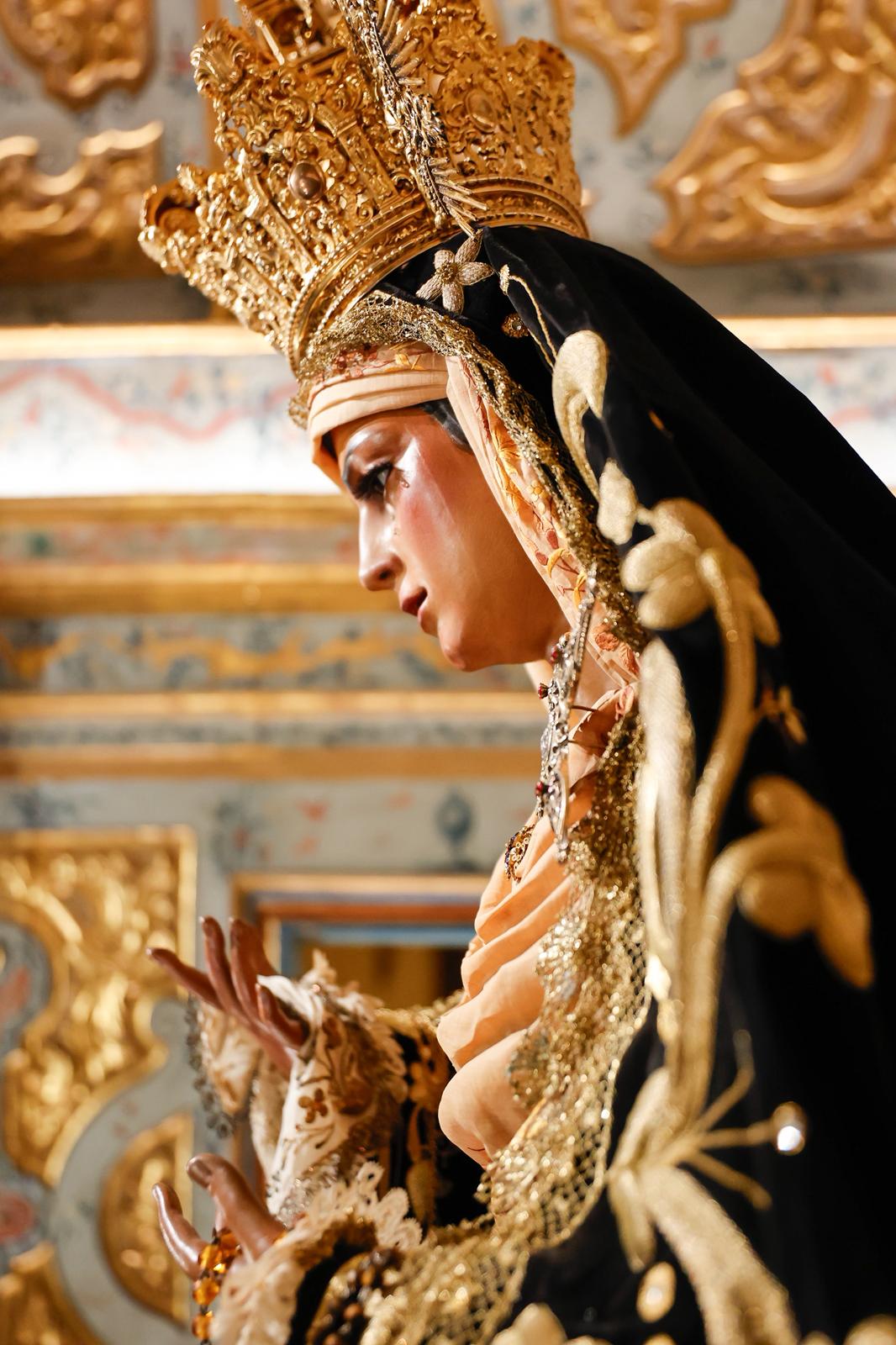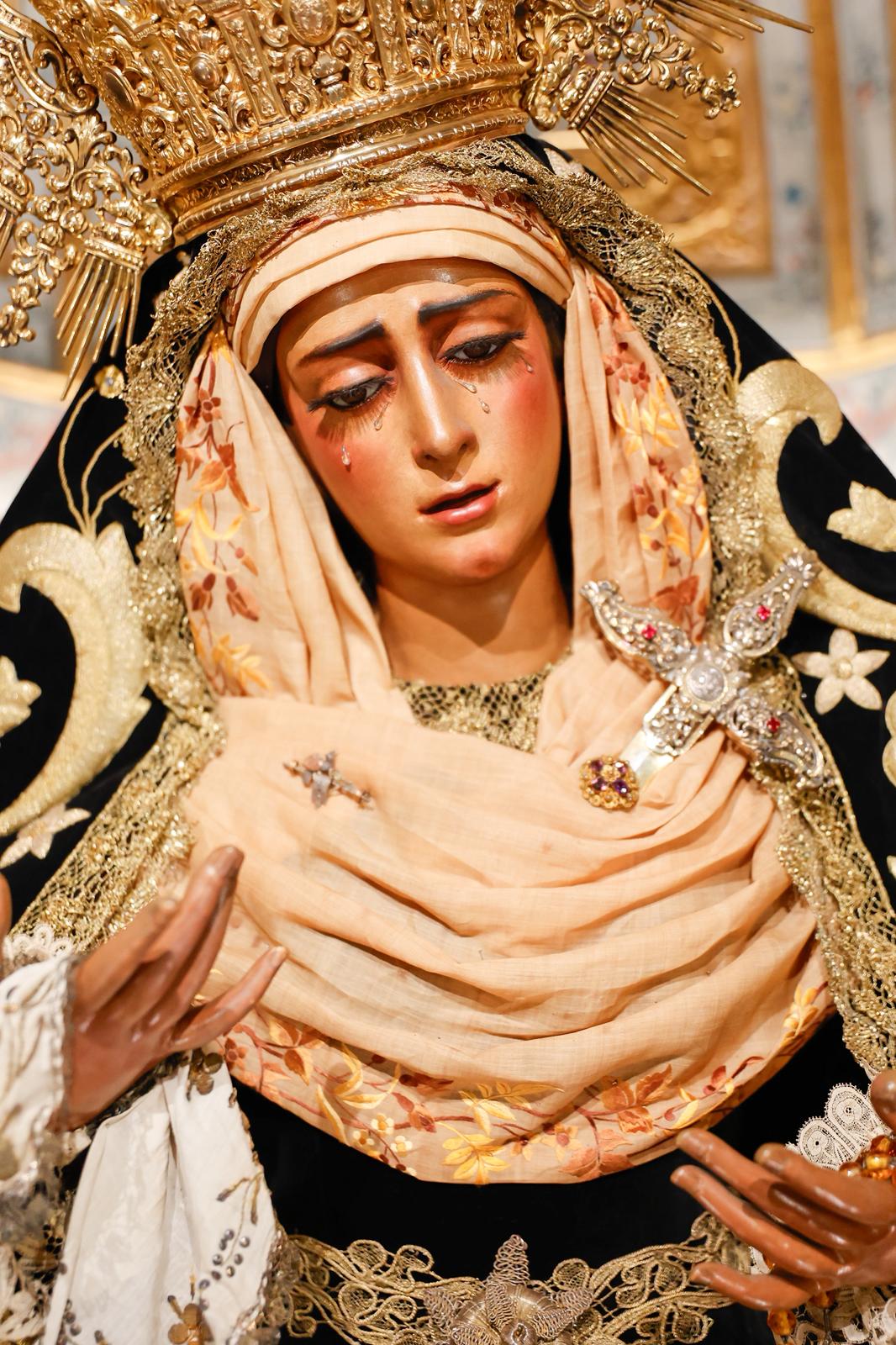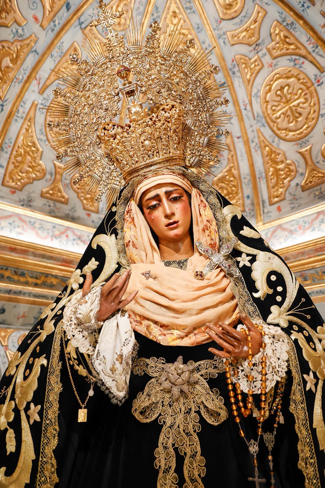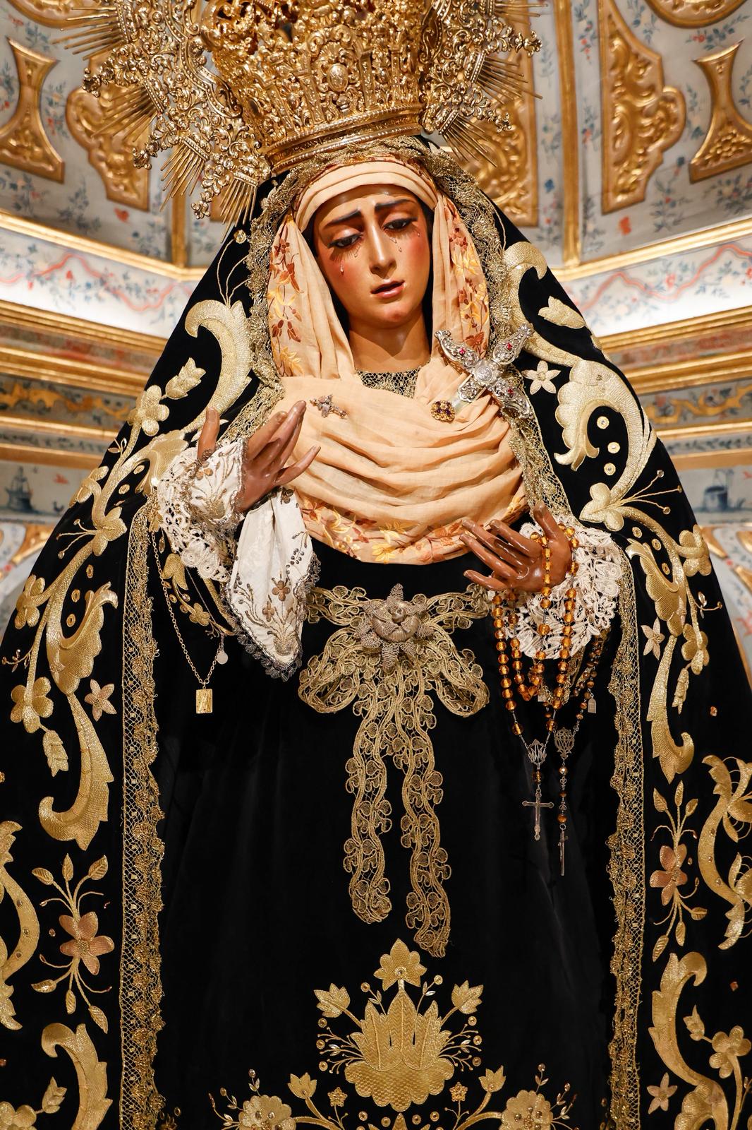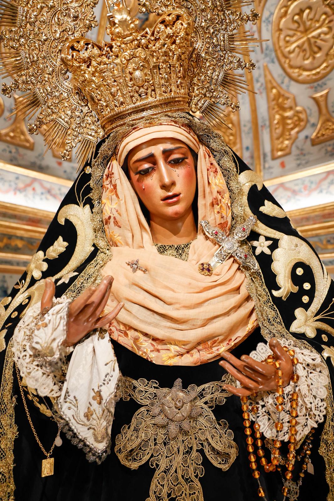 No es una excepción esta festividad en el uso de los signos, por eso se utiliza el negro o el morado en las vestiduras, como en nuestros propios lutos, las joyas más modestas y de tonos apagados, el tocado más lánguido o sencillo, la especial presencia del pañuelo, que para darle visión a ese elemento que representa el dolor de María o el nuestro propio, se pone o más grande de lo habitual, o más llamativo por su tono o bordado, en definitiva con algo que lo haga peculiar y visible para que el fiel se fije especialmente en su significación.