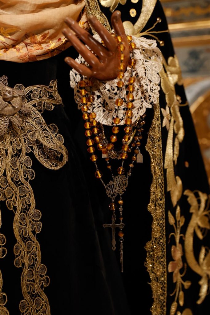 De estos mismos tonos son los dos rosarios que porta, para destacar esta oración que tanto se reza por nuestros difuntos, uno es de cristal facetado y plata del siglo XIX donado por su camarera Antonia Sánchez y el otro es del mismo siglo, en plata y piedras naturales de las llamada ojo de tigre, donado por el grupo Mujeres de la Virgen y que lleva una medallita antigua con la letanía “Consuelo de los Afligidos” que tanto se pronuncia estos días.