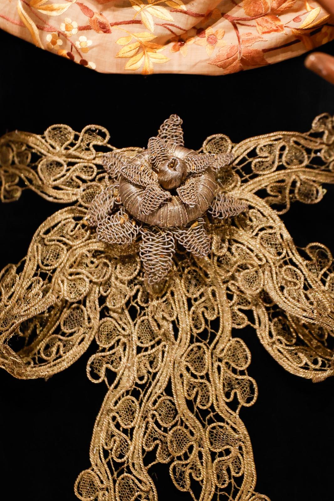 Viste su juego de terciopelo negro bordado en oro por Fernández y Enríquez en 2002 con inspiración decimonónica. El tocado es un precioso tejido antiguo de Nipis Filipino, que es una fibra sacada de la Piña, de un tono precioso y bordado exquisitamente con una guirnalda de rosas en colores ocres y ámbar.