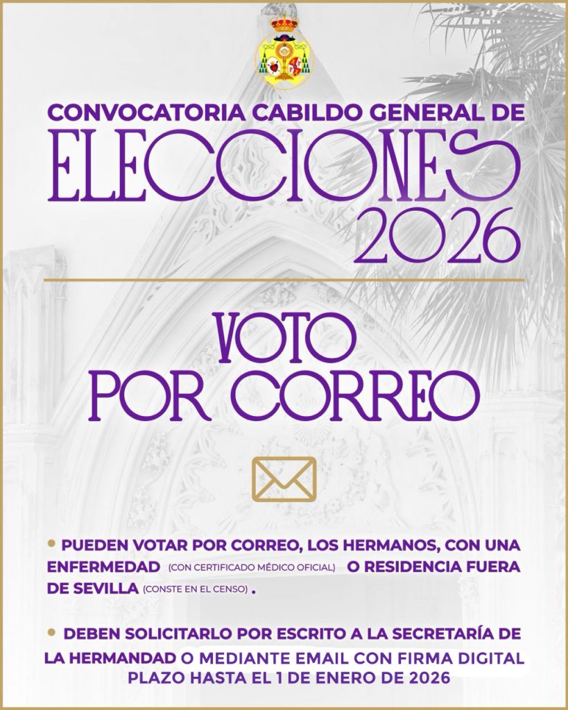 La mencionada solicitud podrá enviarse hasta el jueves día 1 de enero de 2026, fecha en que se cerrará esta posibilidad. Una vez sea recibida la solicitud de voto por correo en la Secretaria de la Hermandad, la Comisión Electoral comprobará que dicha solicitud cumple con las condiciones exigidas y enviará a partir del 1 de enero, a los solicitantes, las papeletas, sobres e instrucciones necesarias para poder ejercer eficazmente el voto por correo.