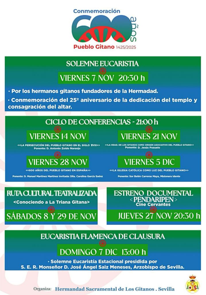 El viernes 7 de noviembre se inaugurará este programa de clausura del Año del Pueblo Gitano con la celebración de una Solemne Eucaristía cuya cátedra ocupará el Rvdo. Padre Fray Juan Dobado, OCD, Director Espiritual de la Hermandad.