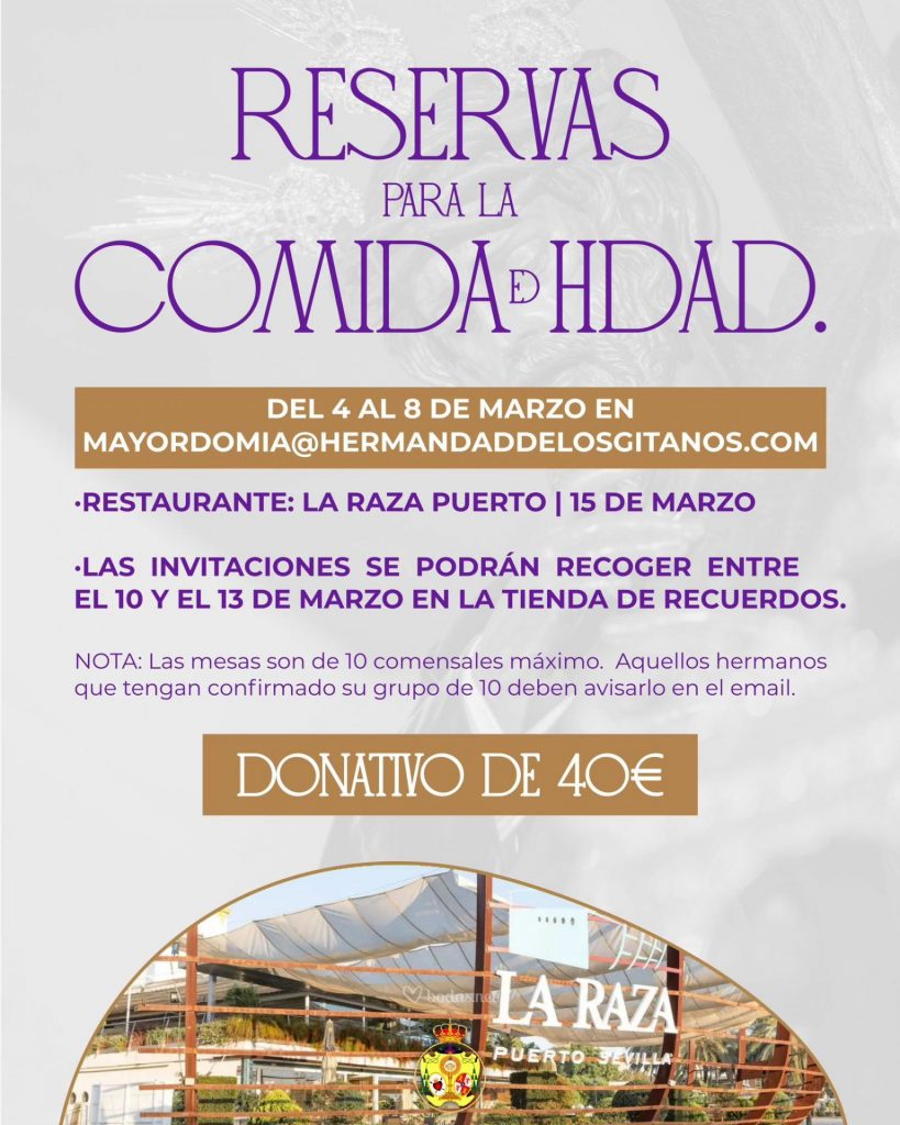Del 4 al 8 de marzo en mayordomia@hermandaddeloagitanos.com puedes realizar la reserva de la Comida de Hermandad. La recogida de invitaciones será del 10 al 13 de marzo en la Tienda de Recuerdos de la Hermandad.