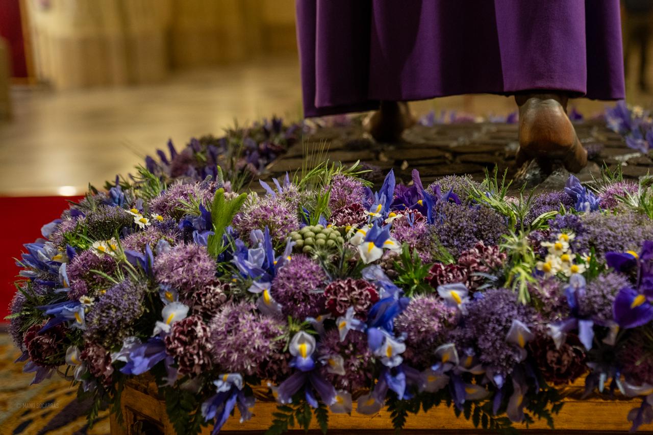 El precioso exorno floral entonado en morado lo forman entre otras especies, lirios e iris, cardos, claveles, brunias, jacintos, allium, manzanilla, romero, espigas verdes y el simbolismo de las verónicas.