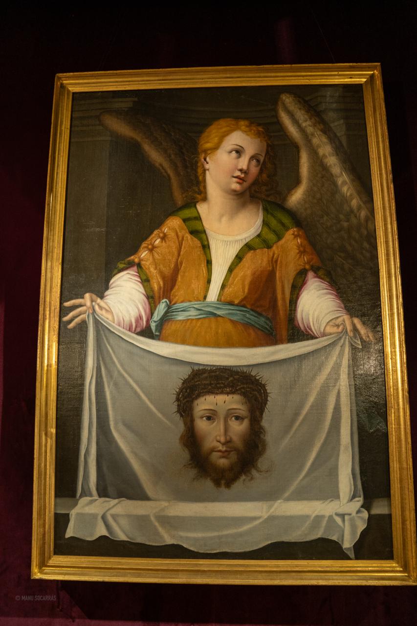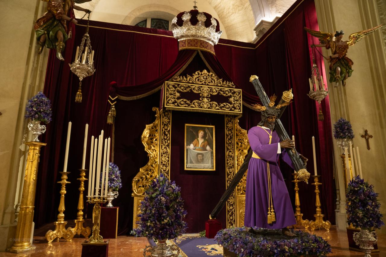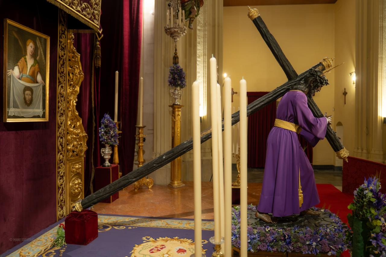 El Equipo de Priostía de la Hermandad ha trabajado en un altar de Besamanos en el presbiterio de nuestro Santuario presidido por el Señor de la Salud bajo un pabellón real enmarcado en su dosel, en el que aparece un maravilloso cuadro de principios del siglo XVII, que representa a un ángel portando el paño de la Verónica con el rostro de Jesús impreso, haciendo realidad la sexta estación del Viacrucis en la que la Verónica enjuga el Rostro de Cristo.