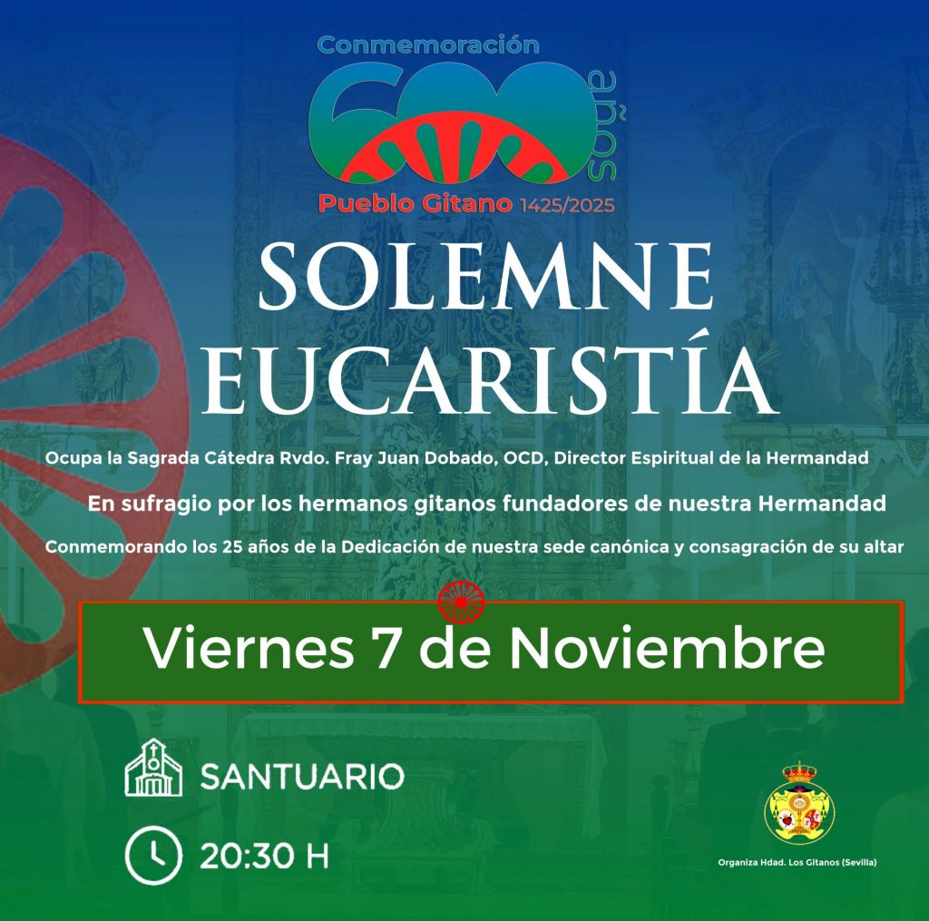 Tal y como se indicó el pasado viernes 31 de octubre, durante el acto de presentación del programa de «Clausura del Año del Pueblo Gitano», el próximo viernes 7 de noviembre se inaugurará dicho programa con la celebración de una Solemne Eucaristía cuya cátedra ocupará el Rvdo. Padre Fray Juan Dobado, OCD, Director Espiritual de la Hermandad.